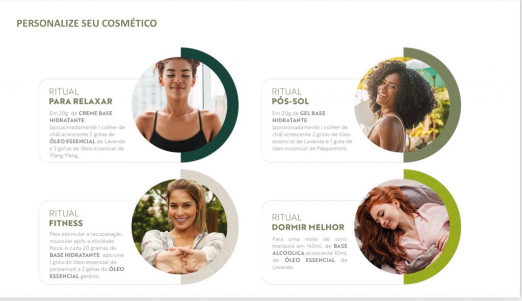 É importante lembrar que os óleos essenciais não podem ser usados sozinhos sobre a pele, já que são altamente concentrados e possuem moléculas com princípios ativos que atuam no corpo.
