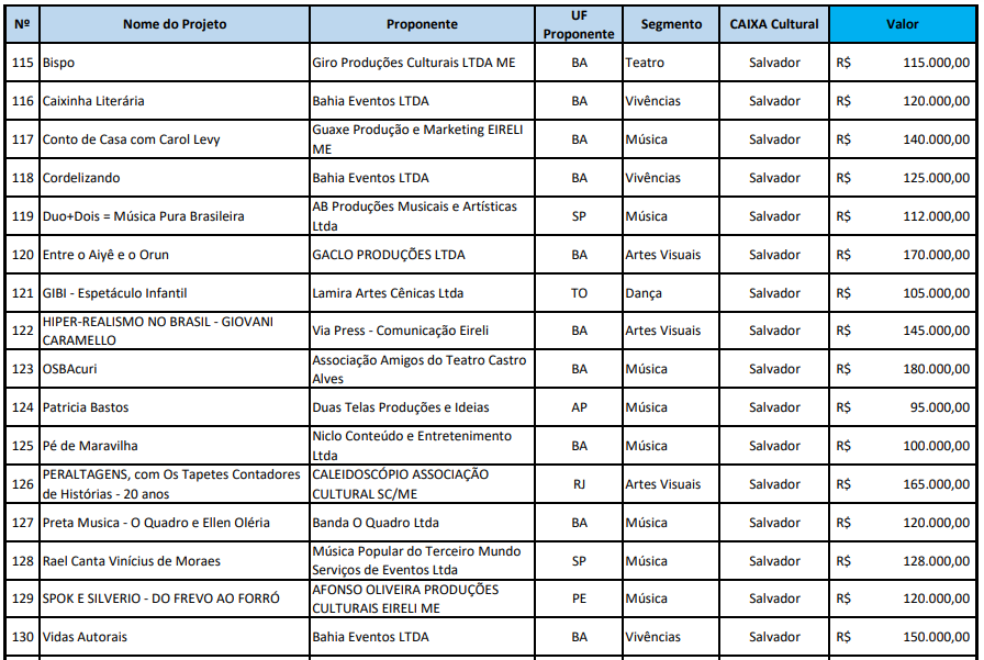 Para a capital baiana foram selecionados 16 projetos, dentre eles um show intimista no qual o rapper Rael canta o repertório de Vinícius de Moraes, que recebeu apoio de R$ 128 mil; o projeto “Preta Música”, encabeçado pelo grupo O Quadro e a cantora Ellen Oléria, com R$ 120 mil; o OSBAcuri, da Orquestra Sinfônica da Bahia, com R$ 180 mil; e o espetáculo teatral “Bispo”, dirigido e estrelado pelo baiano João Miguel, que contou com apoio de R$ 115 mil.