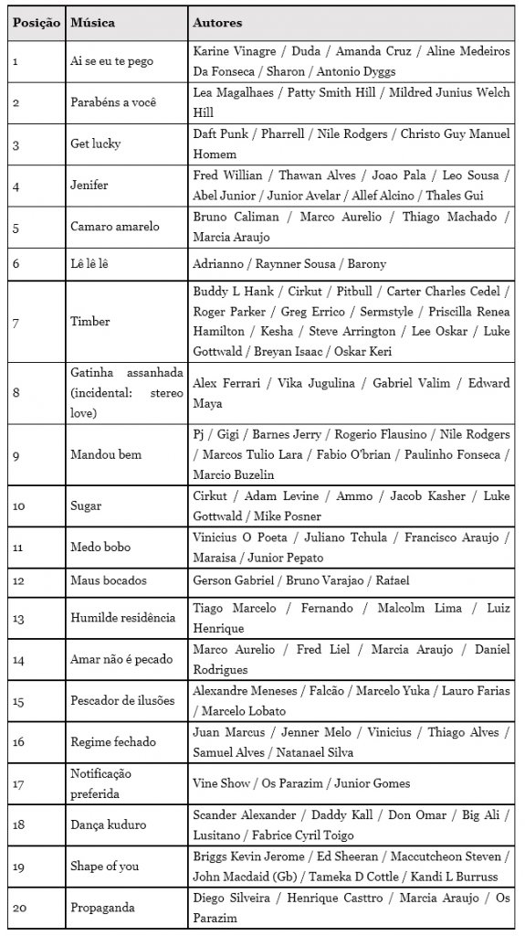 Neste sentido, o Ecad fez também um ranking das 20 músicas mais tocadas na última década nos principais segmentos de execução pública. Nesta lista, 16 das canções são nacionais, sendo a vencedora "Ai Se Eu Te Pego", de Karine Vinagre, Duda, Amanda Cruz, Aline Medeiros Da Fonseca, Sharon e Antonio Dyggs, sucesso na voz de Michel Teló.