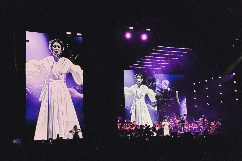 Com regência do maestro André Bachur, Marisa Monte se apresentou acompanhada de uma orquestra sinfônica com 55 músicos pela primeira vez na carreira em um show totalmente seu.