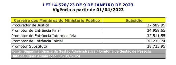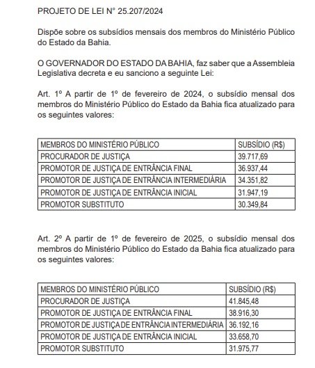 O PL nº 25.207/2024 propõe subsídio base inicial de R$ 39.717,69 para o cargo de procurador de Justiça; R$ 36.937,44 para promotores de entrância final; R$ 34.351,82, promotores de entrância intermediária; R$ 31.947,19 à função de promotor de entrância inicial e R$ 30.349,84, para promotor substituto. Valores que seriam válidos a partir de 1º de fevereiro de 2024.