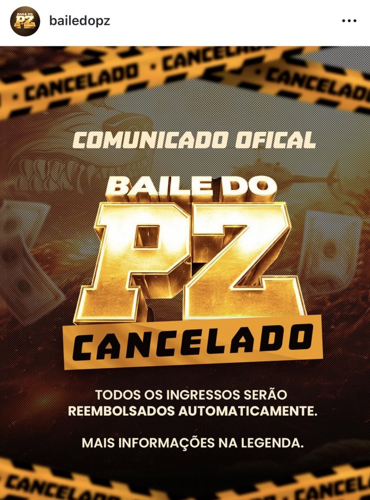 "O Baile do PZ está oficialmente cancelado. Diante dos últimos acontecimentos envolvendo o artista MC Poze do Rodo, optamos por não seguir com a realização do evento. Sabemos da expectativa de todos e essa decisão foi tomada com responsabilidade e respeito ao nosso público."