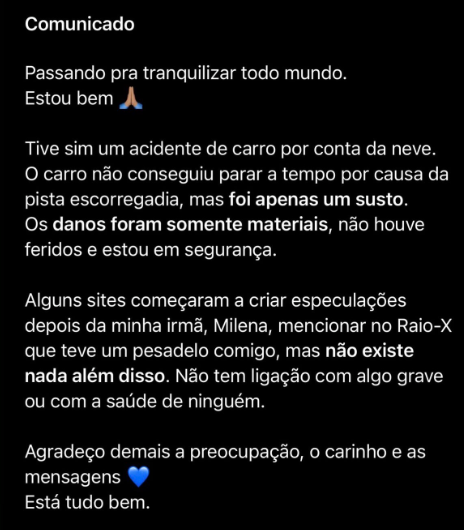 "Estou bem. Tive, sim, um acidente de carro por conta da neve. O carro não conseguiu parar a tempo por causa da pista escorregadia, mas foi apenas um susto. Os danos foram somente materiais, não houve feridos e estou em segurança", relatou em comunicado.