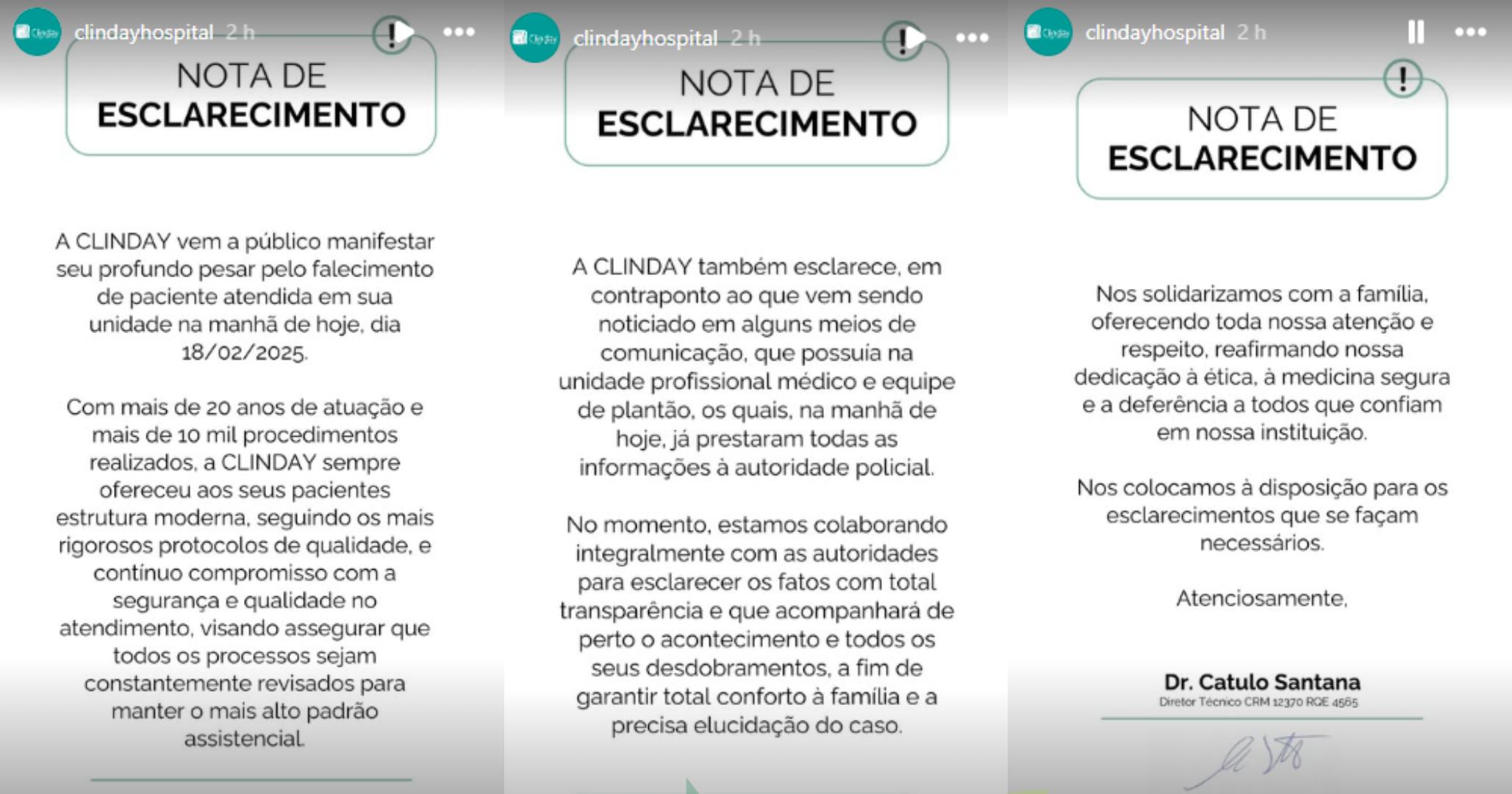 “No momento, estamos colaborando integralmente com as autoridades para esclarecer os fatos com total transparência e que acompanhará de perto o acontecimento e seus desdobramentos, a fim de garantir total conforto à família e a precisa elucidação do caso”, diz a nota, publicada em perfis das redes sociais da empresa e assinada pelo Dr. Catulo Santana.
