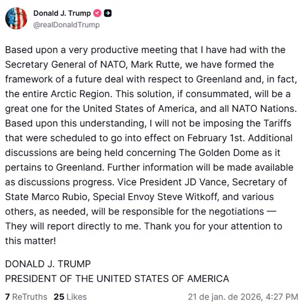 Sobre isso, Trump respondeu, citando o tarifaço contra o Brasil, que era o maior fornecedor de carne para a indústria norte-americana. "Os pecuaristas, que eu amo, não entendem que a única razão pela qual estão indo bem, pela primeira vez em décadas, é porque eu impus tarifas sobre o gado que entra nos EUA, incluindo uma tarifa de 50% sobre o Brasil", disse Trump em sua rede social.