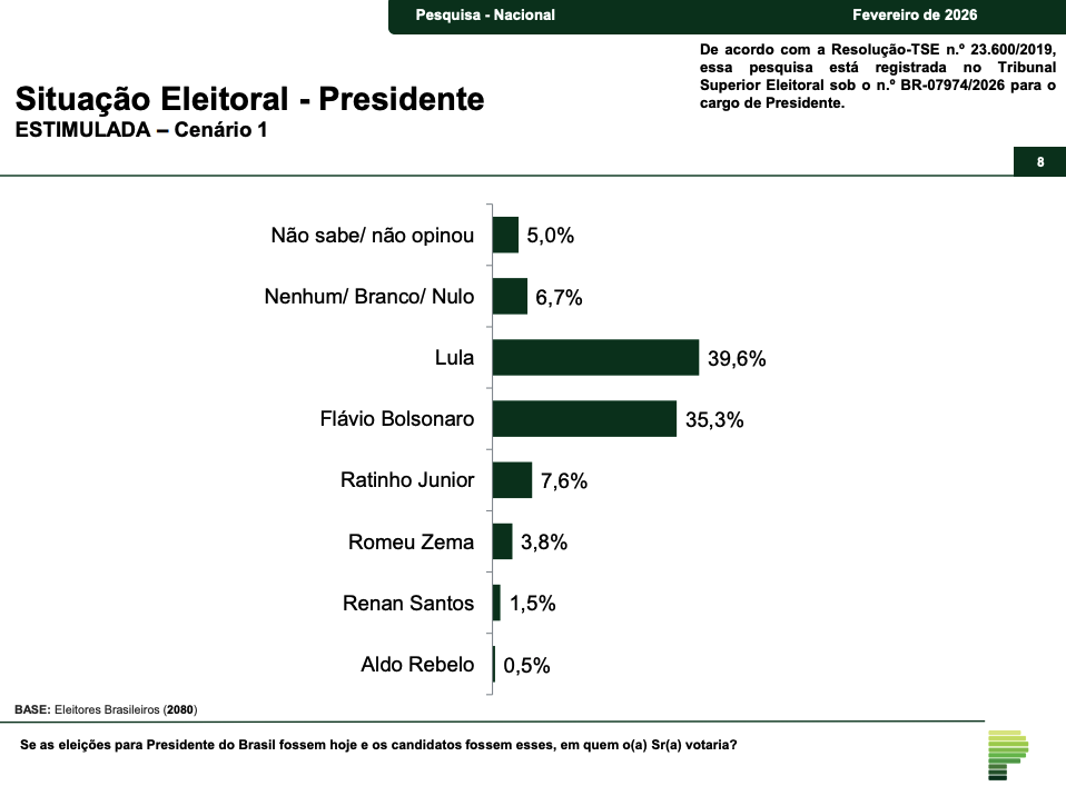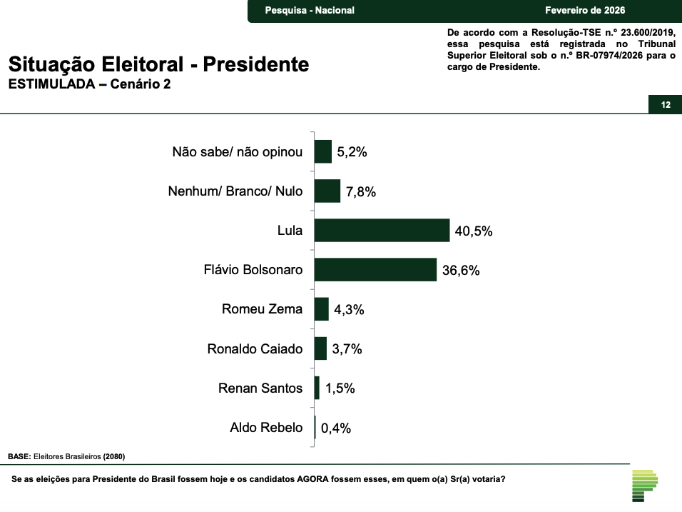 Nesse cenário, Lula tem 43% das intenções de voto, enquanto Flávio marca 38%, com 2% de indecisos e 17% de branco, nulo ou que não pretendem votar. Em dezembro, o presidente tinha 46% contra 36% do senador (diferença de 10 pontos). Em janeiro, eram 45% a 38% (diferença de 7 pontos).
