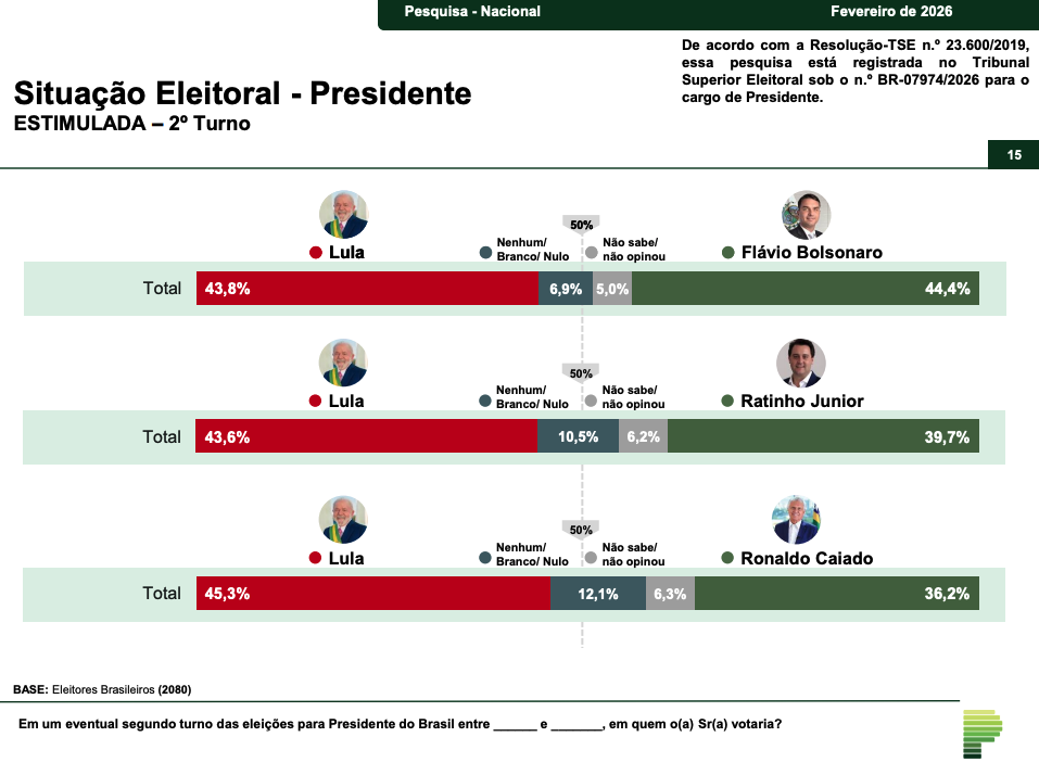 Contra Ronaldo Caiado, o presidente aparece com 42% (eram 44% em janeiro), enquanto o governador de Goiás tem 32% (eram 33%). Indecisos somam 4%, e branco/nulo/não vai votar, 22% (eram 19%).