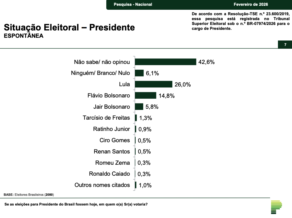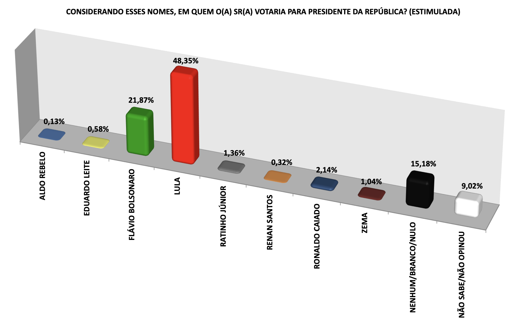 Em todos os cenários, inclusive no espontâneo (em que os entrevistados respondem sem a apresentação de listas com nomes), Lula lidera acima da margem de erro da pesquisa, que é de dois pontos percentuais. O adversário mais forte do atual presidente, assim como já mostrado em outras sondagens, é o candidato do PL, o senador Flávio Bolsonaro (PL-RJ).