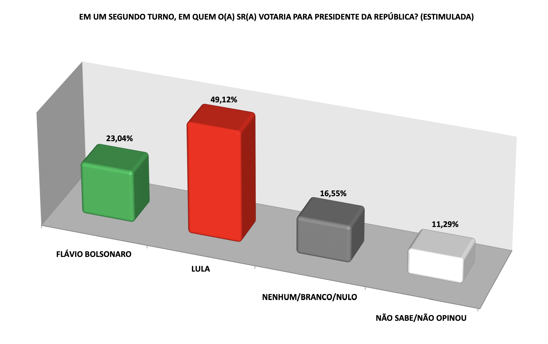 Os números apurados mostram que o presidente Lula, ao mesmo tempo em que é o candidato mais conhecido, é aquele que reúne o maior contingente de eleitores certos do seu voto. Já Flávio Bolsonaro é menos conhecido, tem menos votos certos e rejeição maior do que a do presidente.