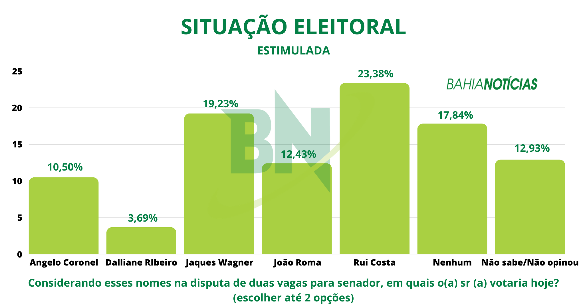 A pesquisa testou ainda os nomes de João Roma (PL) e Angelo Coronel (sem partido). O ex-ministro da Cidadania do governo de Jair Bolsonaro foi citado por 12,43%, enquanto o senador, que deve ser candidato à reeleição, foi opção para 10,5% dos entrevistados. Dalliane Ribeiro também foi testada e foi opção para 3,69% dos eleitores.