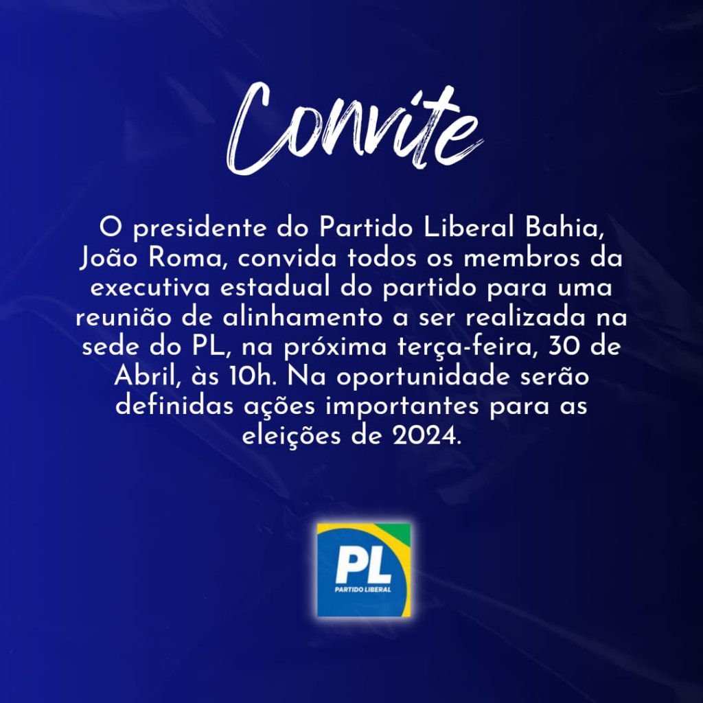 O presidente do Partido Liberal (PL) na Bahia, João Roma, convocou uma reunião com os membros da executiva estadual do partido para a próxima terça-feira (30). No convite, o encontro é divulgado como reunião de alinhamento, onde "ações importantes" serão definidas para as eleições de 2024.