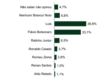 Em todos os cenários, inclusive no espontâneo (em que os entrevistados respondem sem a apresentação de listas com nomes), Lula lidera acima da margem de erro da pesquisa, que é de dois pontos percentuais. O adversário mais forte do atual presidente, assim como já mostrado em outras sondagens, é o candidato do PL, o senador Flávio Bolsonaro (PL-RJ).