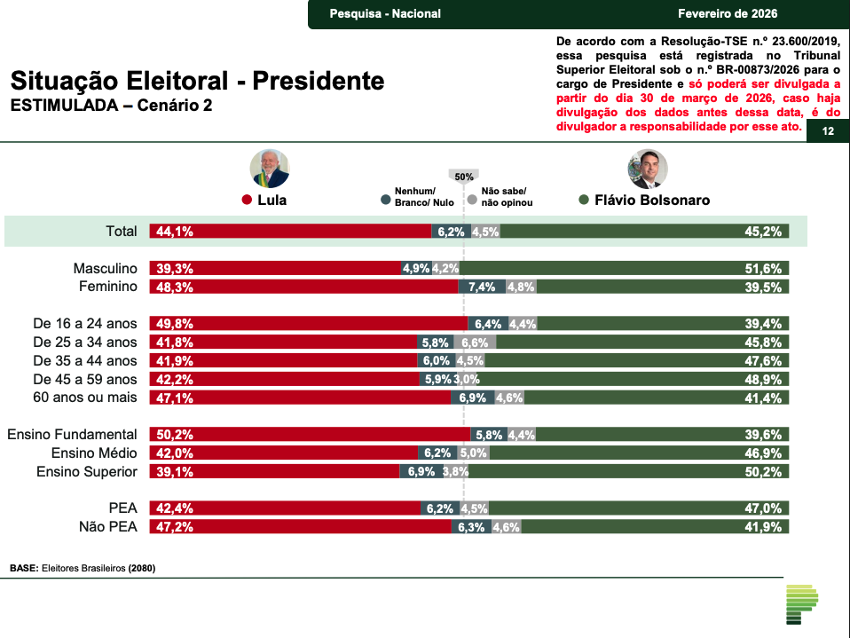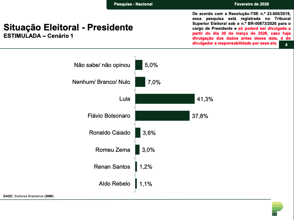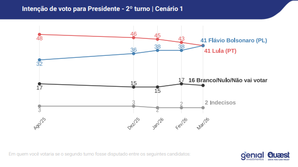 Nesse cenário, Lula aparece com 41% das intenções de voto, mesmo percentual de Flávio Bolsonaro. A pesquisa registra ainda 16% de votos brancos ou nulos e 2% de eleitores indecisos.