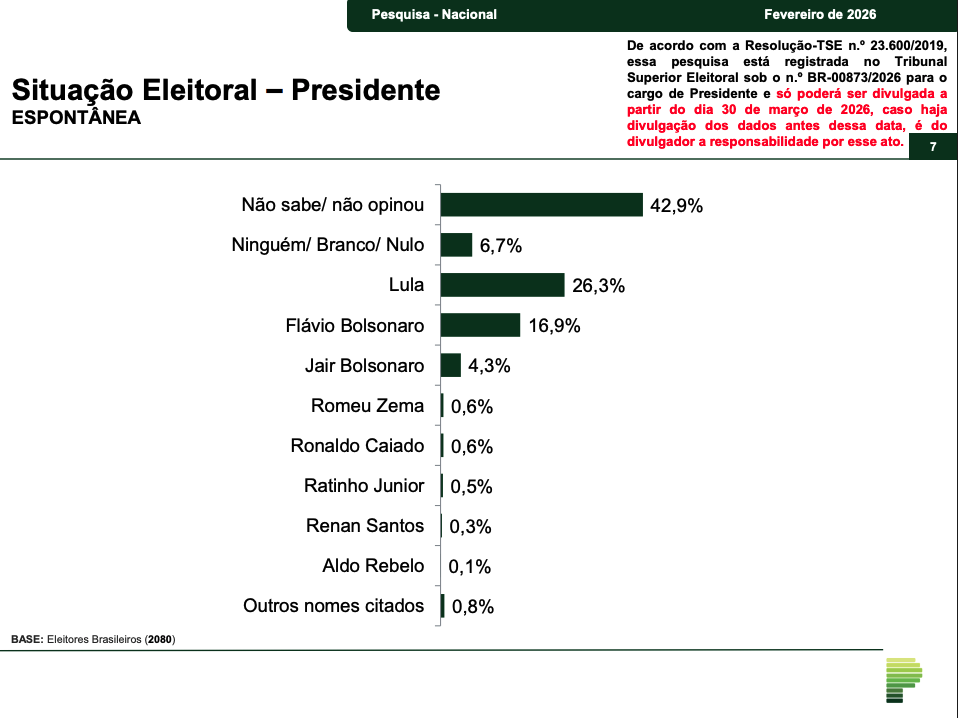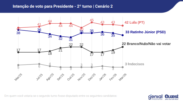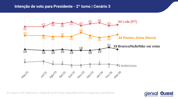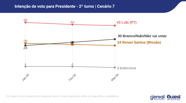 O levantamento também incluiu cenários contra outros nomes. O fundador do Missão, Renan Santos, aparece com 24% das intenções de voto, contra 43% de Lula. Nesse caso, 30% votariam em branco ou nulo e 3% estão indecisos.