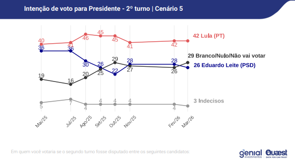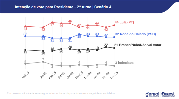 Contra Caiado, Lula teria 44% das intenções de voto, contra 32% do governador. Nesse cenário, 21% votariam em branco ou nulo e 3% estão indecisos. Já contra Eduardo Leite, o presidente venceria por 44% a 26%.