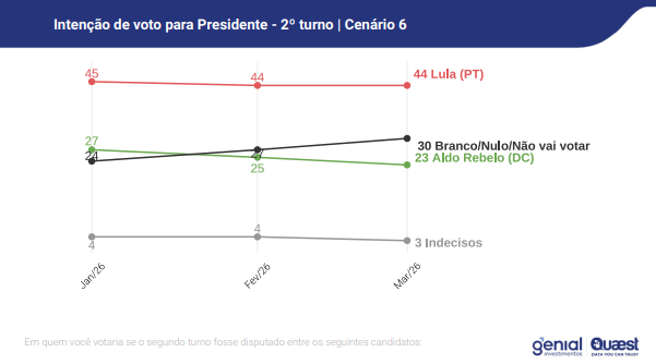 Já o ex-ministro Aldo Rebelo, pré-candidato do Democracia Cristã, registra o pior desempenho entre os testados: 23% das intenções de voto, contra 44% de Lula. Nesse cenário, 30% votariam em branco ou nulo e 3% estão indecisos.