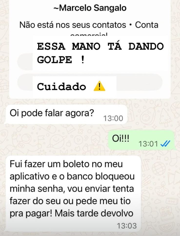 "Fui fazer um boleto no meu aplicativo e o banco bloqueou minha senha, vou enviar tenta fazer do seu ou pede meu tio pra pagar! Mais tarde devolvo", escreveu o suposto golpista.
