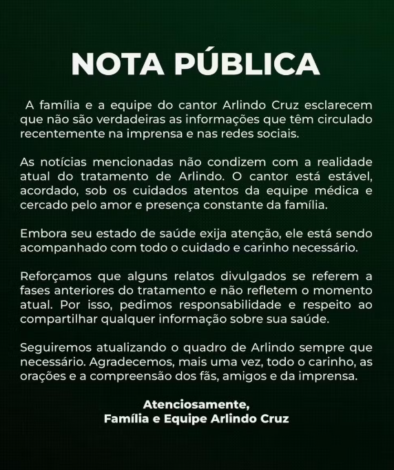 "O cantor está estável, acordado, sob os cuidados atentos da equipe médica e cercado pelo amor e presença constante da família. Embora o estado de saúde exija atenção, ele está sendo acompanhado com todo o cuidado e carinho necessário."